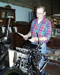 See Dan at left, brushing the dust off some of our old engravings and printing them on the Heidelberg for our catalog.