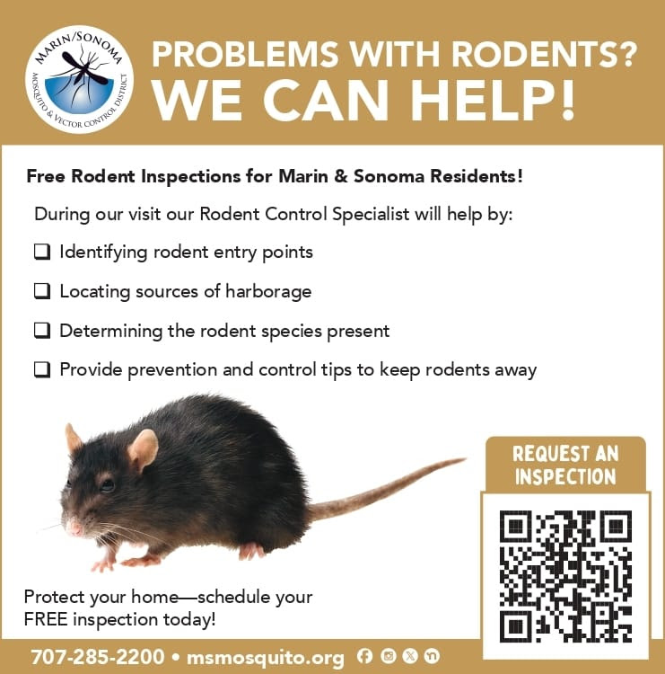 The Marin/Sonoma Mosquito & Vector Control District is offering free rodent inspections to residents. During a home visit, a Rodent Control Specialist will: identify entry points, locate sources of harborage, determine the rodent species present, and provide prevention and control tips to keep rodents away.