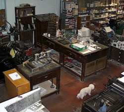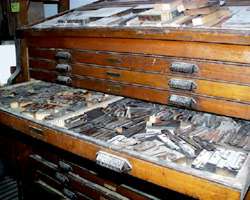 At the present time, we are creating a catalog of all our engravings and wood and metal type styles. Dan Burke is making proofs of everything in all our beautiful wooden cases and vacuming off the dust of years! check back with us for more information. |